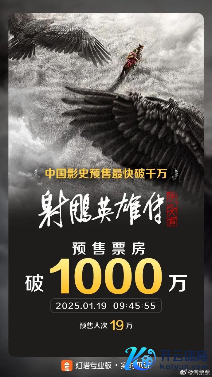 据猫眼专科版数据,2025年1月19日9时55分,2025年春节档新片预售总票房破1000万!《射雕英杰传:侠之大者》《哪吒之魔童闹海》《封神第二部:战火西岐》分列2025年春节档新片预售票房榜前三。