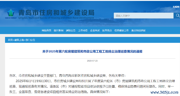 日前,青岛市住房和城乡成立局组织开展了年度第六轮区(市)房屋建筑和市政公用工程工地扬尘治理考核,现通报考核关系情况。并条目各区(市)对通报较差名堂照章依规给以解决,确保扬尘隐患问题闭环整改。同期,举一反三,全面排查,督促各成扬名堂圭表落实扬尘防治轮番。具体情况如下: