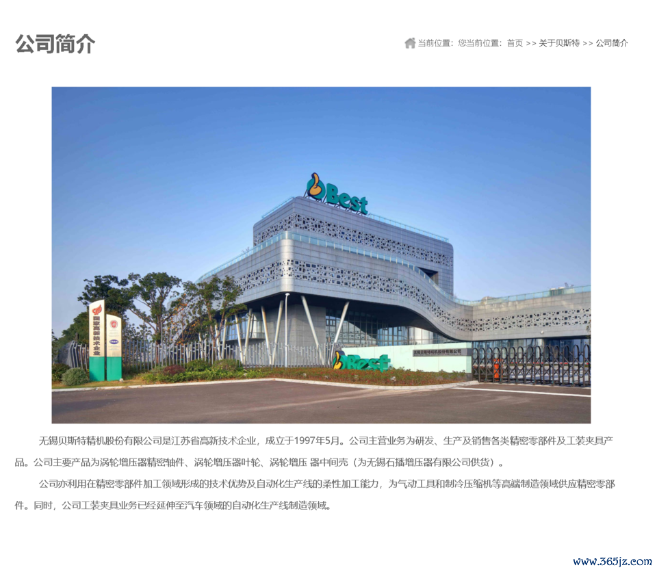 该公司官网先容,无锡贝斯特精机股份有限公司是江苏省高新时代企业,征战于1997年5月。公司主贸易务为研发、分娩及销售种种精密零部件及工装夹具居品。公司主要居品为涡轮增压器精密轴件、涡轮增压器叶轮、涡轮增压器中间壳(为无锡石播增压器有限公司供货)。